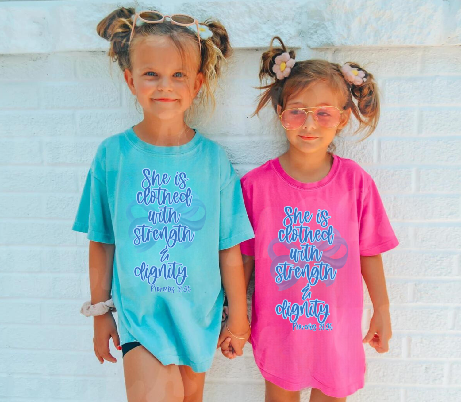 Crafted from 100% cotton. Shirt brand is Comfort Colors.